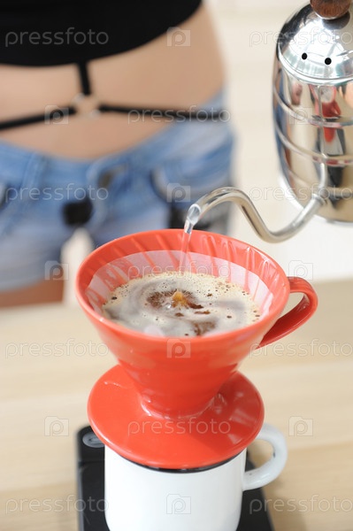 Девушка-бариста заваривает кофе капельным методом. налив воды из чайника на гибкой шее в красную воронку hario v60