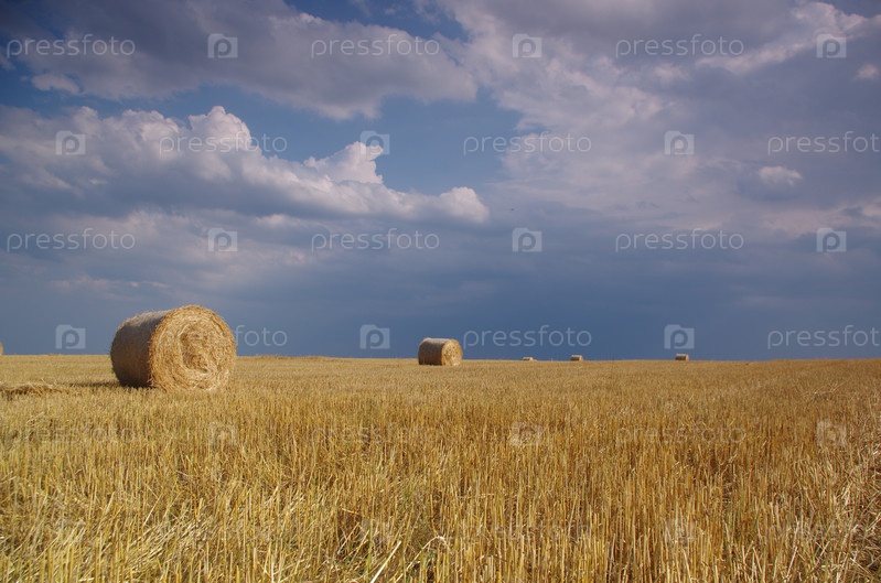 Скрученный стог сена на скошенном поле на фоне облачного неба