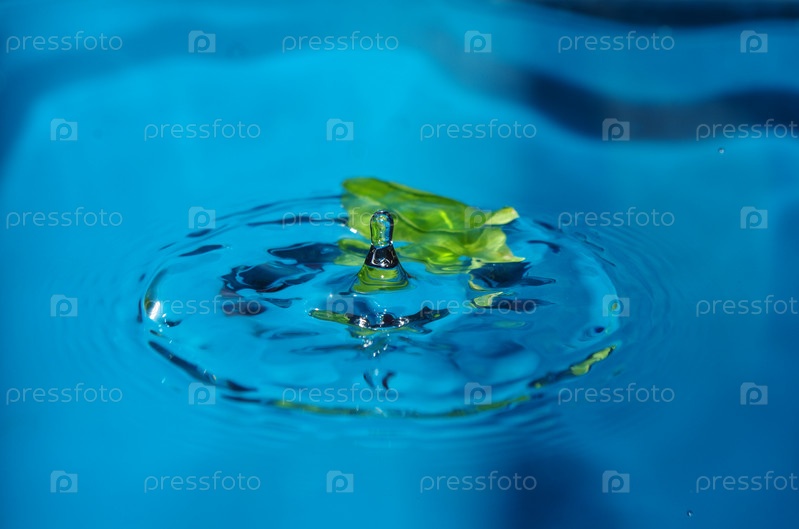 Всплеск капли воды крупным планом с зеленым листом на синем фоне