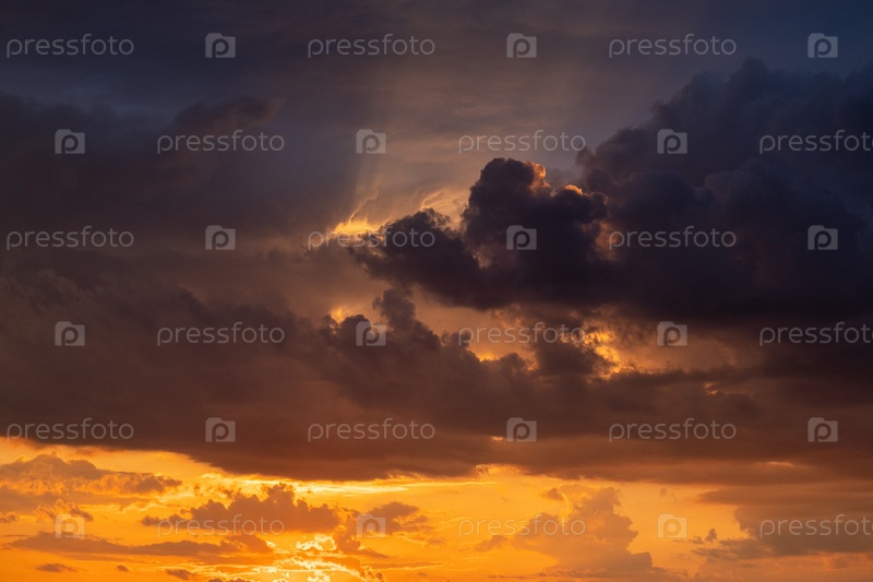 Красивый закат с золотым, красным, желтым и оранжевым солнечным светом, проходящим через множество облаков разных оттенков. Горизонтальное фото. Природа. Небо. Облачно. Фон