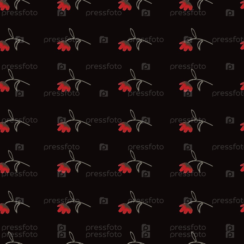 Черная бесшовная текстура с красными цветами акварель