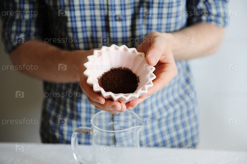 Мужчина держит в руках розовую керамическую капельницу оригами крупным планом без лица. Молотый кофе в бумажном фильтре. Ручное заваривание