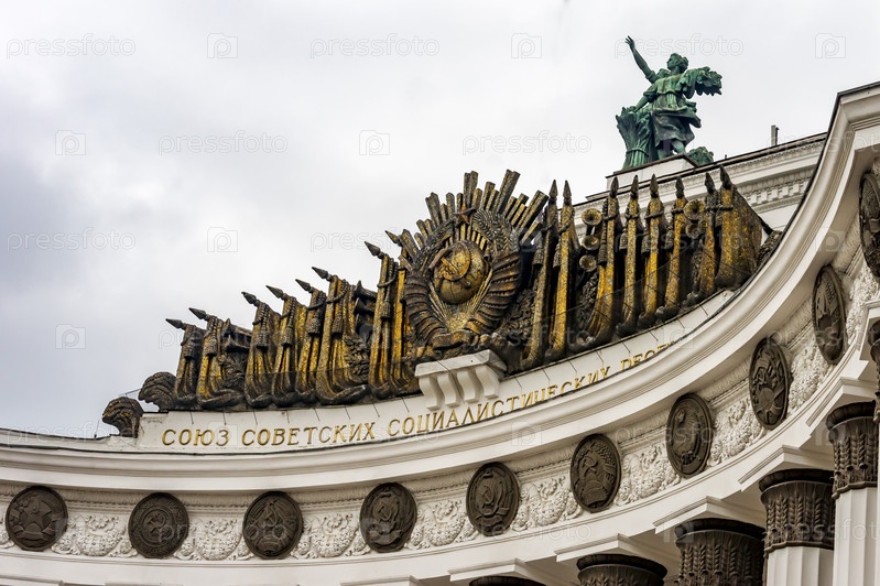 Москва, Россия - 16 марта 2017 г.: Центральный павильон на ВДНХ. Фрагмент. Образец архитектурного стиля советского периода