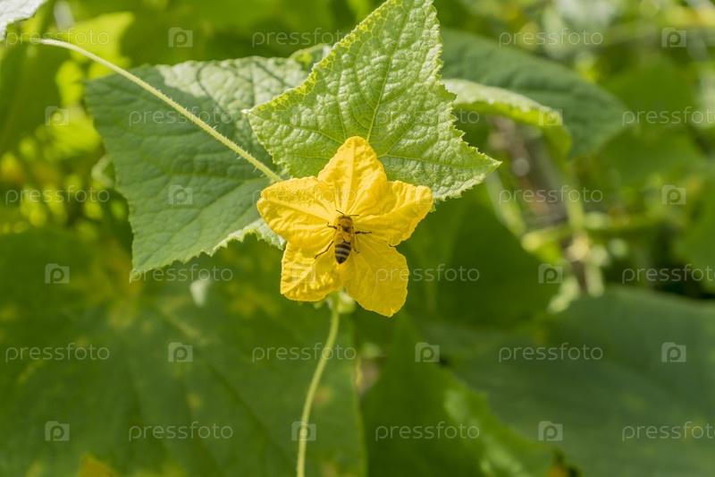 Пчела собирает мед с цветков огурцов