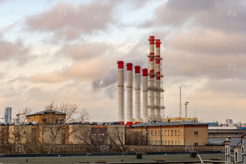 Вид на промышленный город - старые красные и белые дымовые трубы на фоне закатного неба