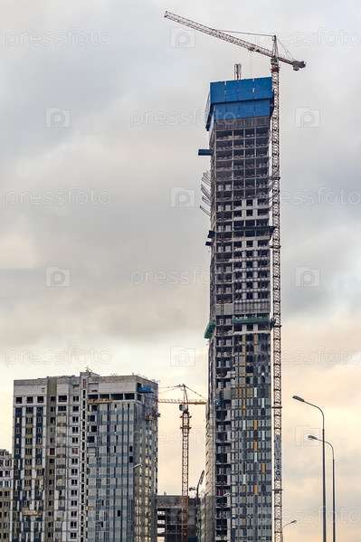 Кран и строительная площадка против облачного неба
