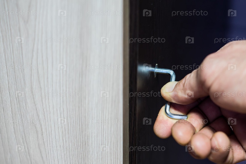 Сборка мебели, шестигранный ключ крупным планом в мужской руке