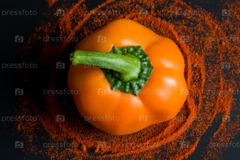 Оранжевый сладкий перец и порошок паприки на черном фоне, вид сверху