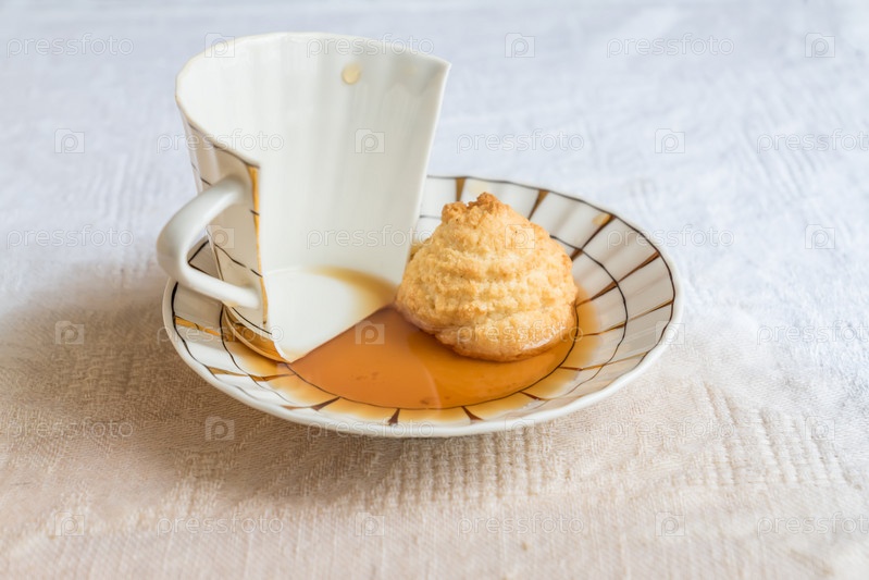 Разбитая фарфоровая чашка с чаем и печеньем на хлопковой скатерти