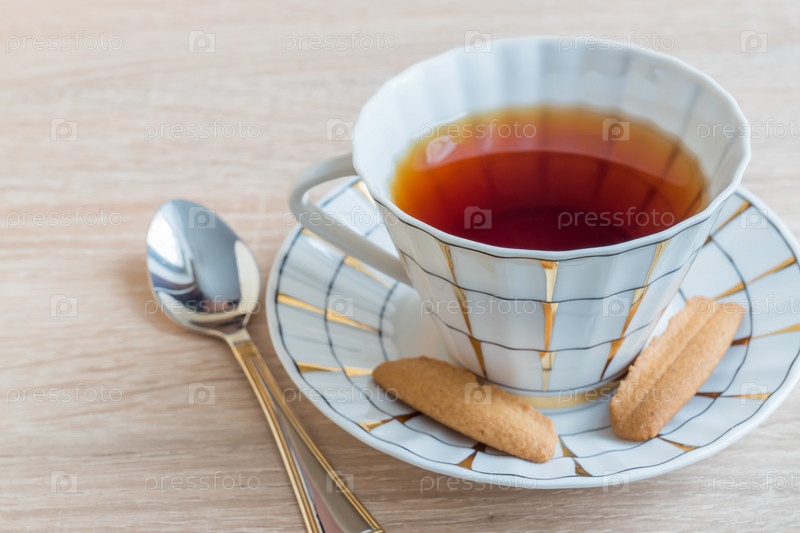 Чашка черного чая с вкусным хрустящим печеньем на деревянном столе