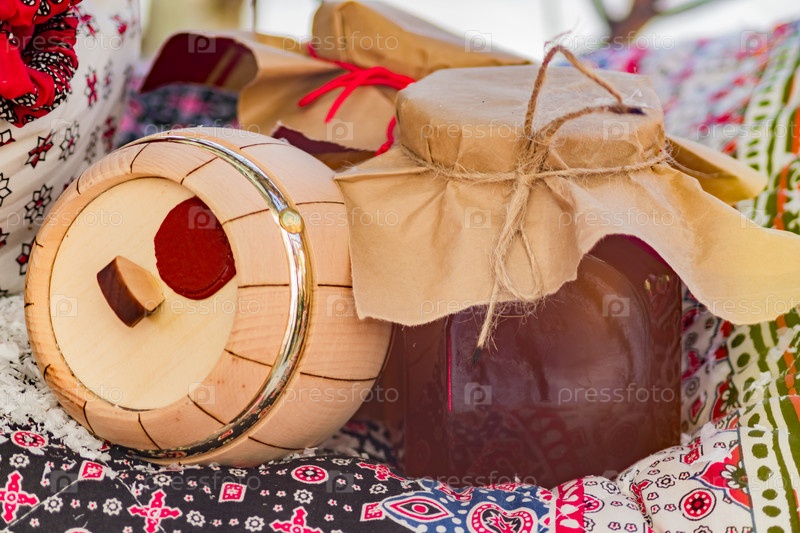 Деревянная бочка и газовый кувшин, полный меда. Украшение в традиционном русском стиле