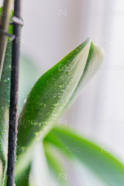 Крупный план зеленого листа с каплями воды после опрыскивания, комнатное растение орхидеи