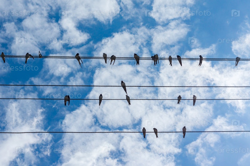 Стая ласточек, сидящих на проводах на фоне голубого неба
