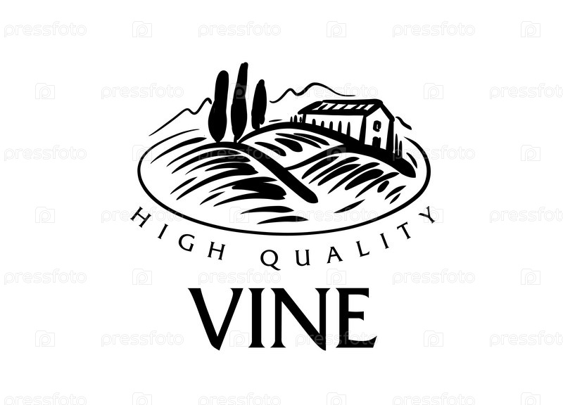 Логотип, нарисованный вручную. Пейзаж виноградников для изготовления вина