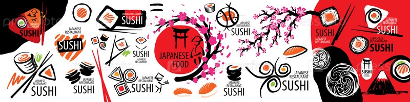 Большой набор логотипов японской кухни на белом фоне