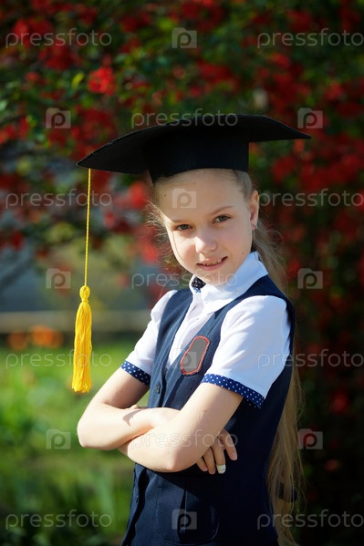 Девушка выпускница начальной школы в выпускной шапке и школьной форме