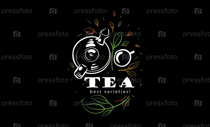 Векторный логотип с раскрашенным чайником, чашкой чая и листьями на черном фоне