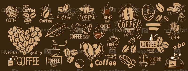 Большой векторный набор нарисованных логотипов и кофейных элементов