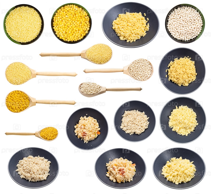 Набор различных приготовленных и сырых изолированных кускусов