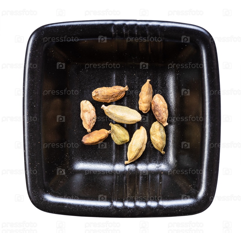Несколько стручков кардамона в черной миске изолированы