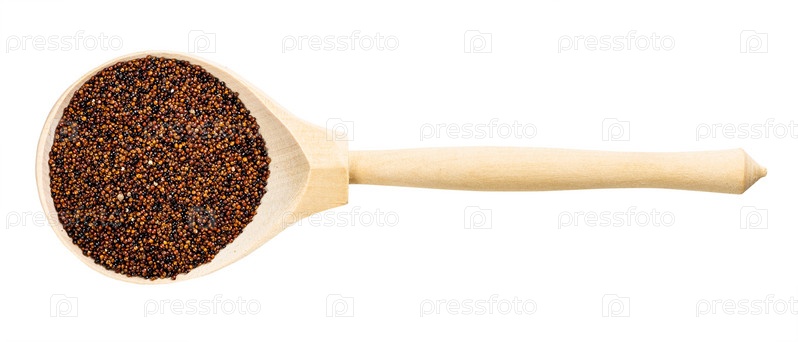 Вид сверху на деревянную ложку с сырыми зернами канихуа