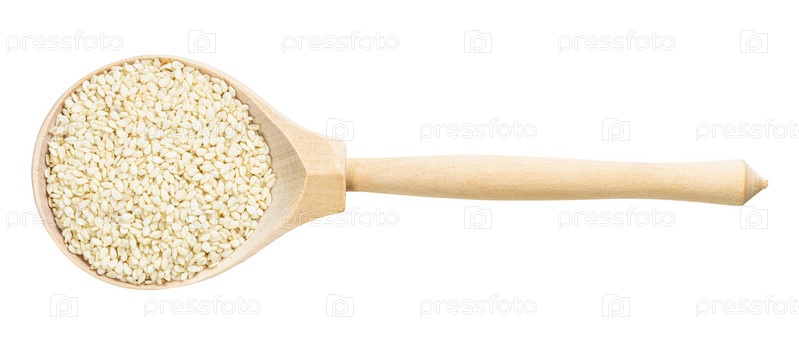 Вид сверху на деревянную ложку с белыми семенами кунжута