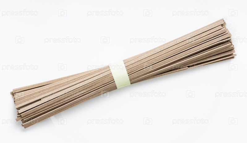 Куча сушеной плоской лапши соба на белой тарелке