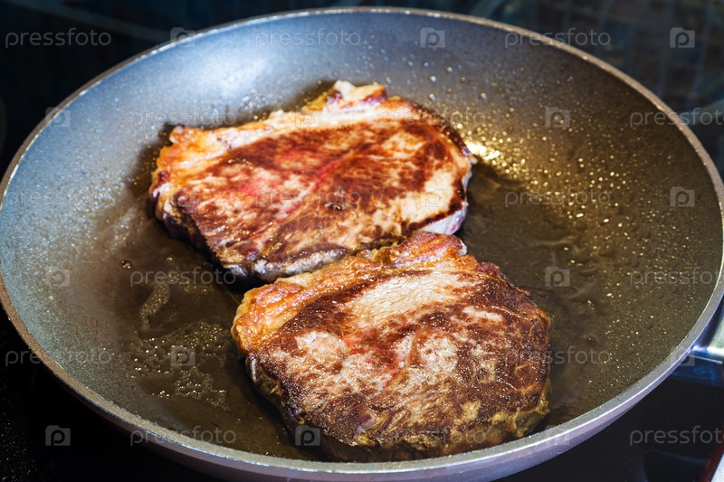 Два жареных куска мяса на сковороде на плите