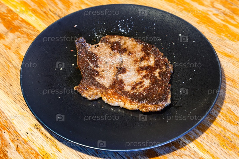 Кусок жареного мяса на черной тарелке на столе