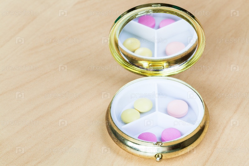 Таблетница с зеркалом с розовыми и желтыми таблетками