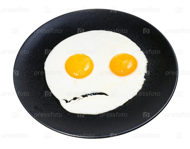 Жареные яйца на черной тарелке, изолированные на белом фоне