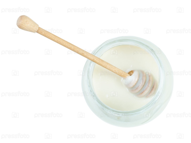 Деревянная палочка на поверхности белого меда в банке