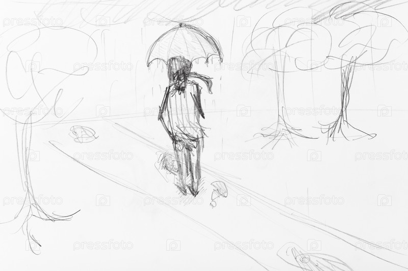 Эскиз человека под зонтиком, идущего под дождем