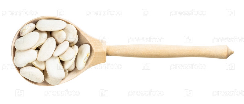 Вид сверху на деревянную ложку с изолированными лимскими бобами
