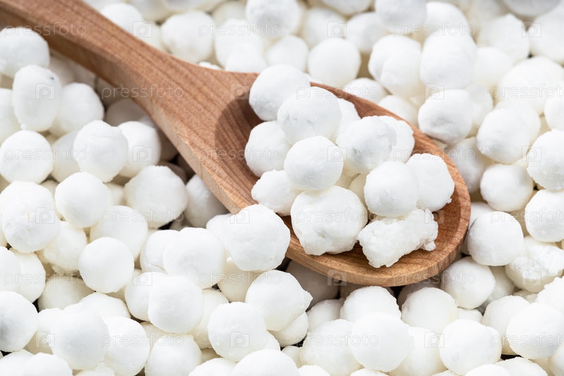 Вид сверху на деревянную ложку с сырым жемчугом тапиоки