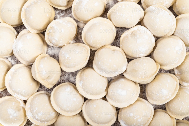 Вид сверху на множество замороженных пельменей