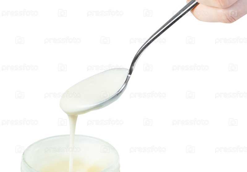 Белый мед льется из стальной ложки в стеклянную банку