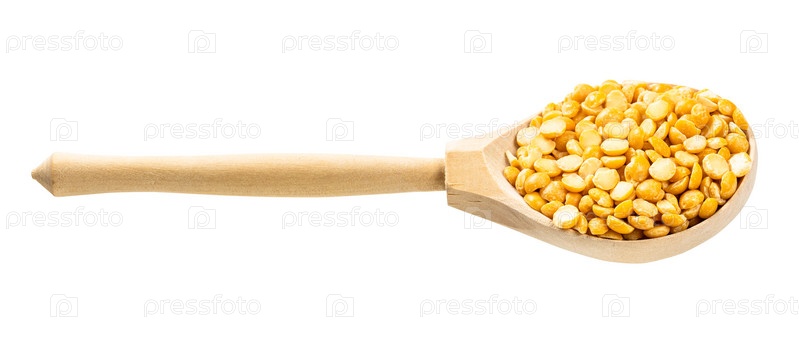 Деревянная ложка с сушеным колотым желтым горошком изолирована