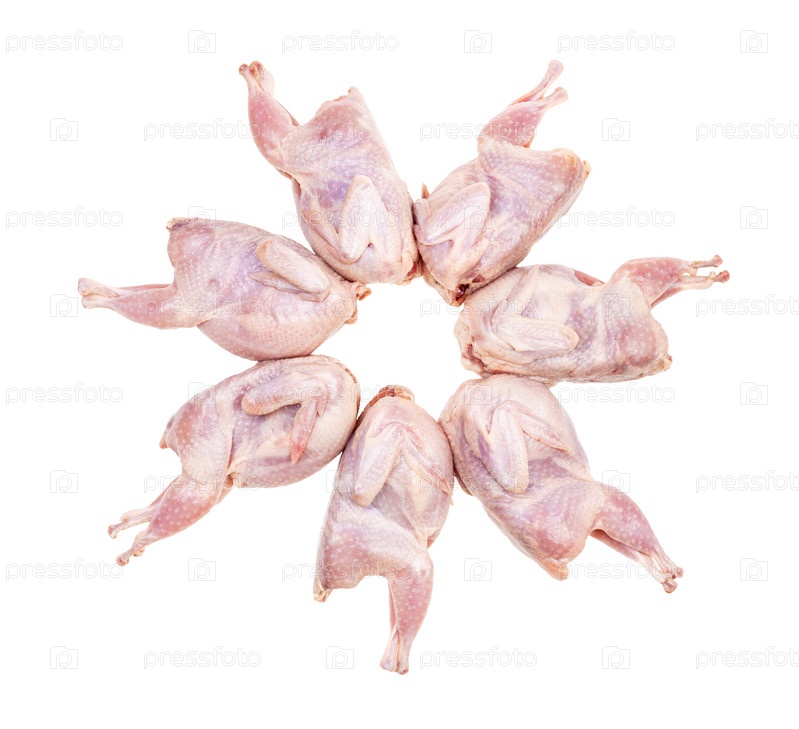 Круг из сырых ощипанных перепелов, изолированных на белом