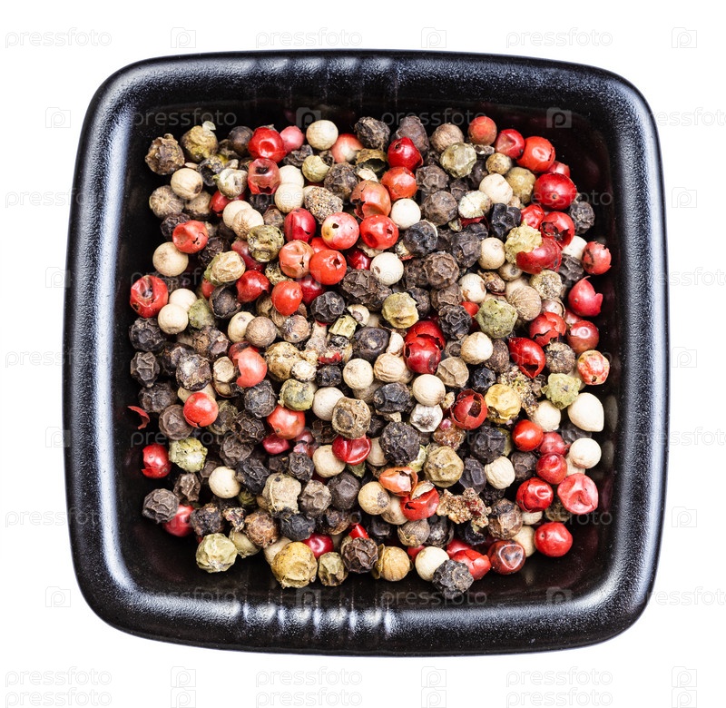 Перечные горошины смеси перца в черной миске изолированы
