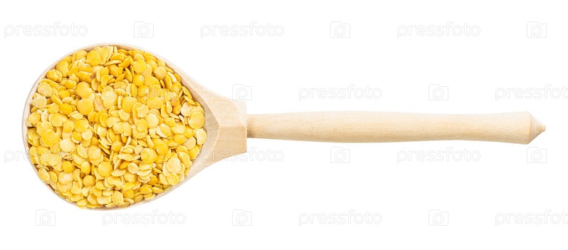 Вид сверху на деревянную ложку с расщепленной желтой чечевицей
