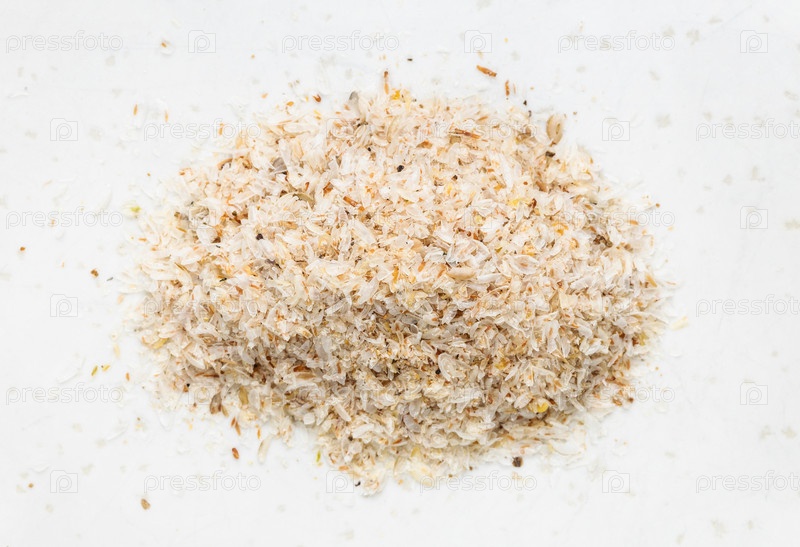 Вид сверху на кучу шелухи подорожника крупным планом на сером