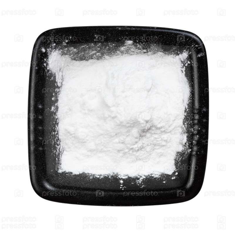 Вид сверху на картофельный крахмал в черной миске изолирован