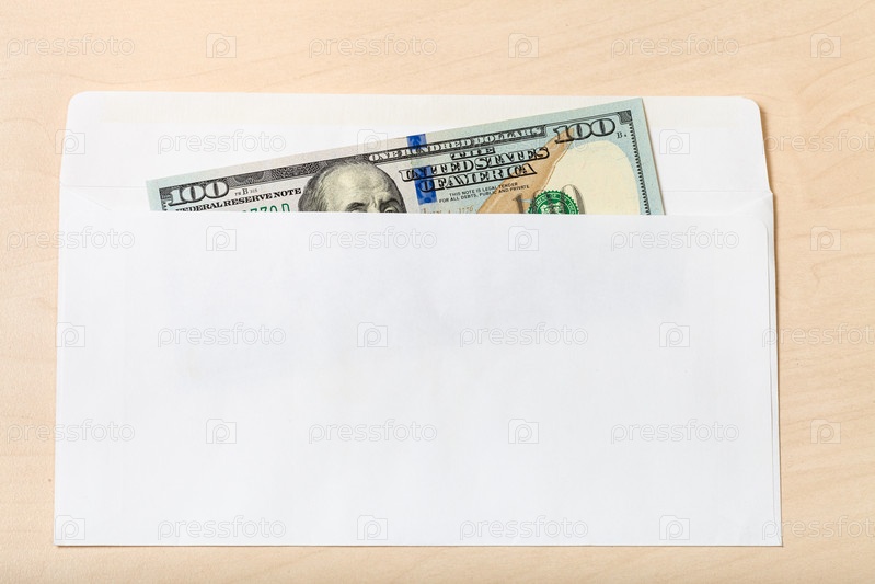 Стодолларовая купюра в открытом конверте на столе
