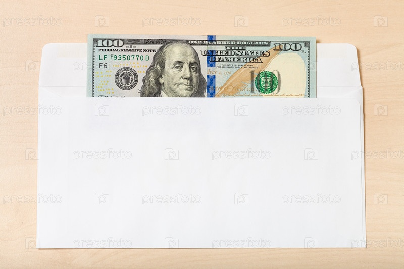 Стодолларовая купюра в открытом конверте на столе