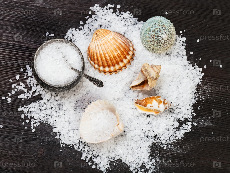 Солонка, ракушки и грубая морская соль на столе