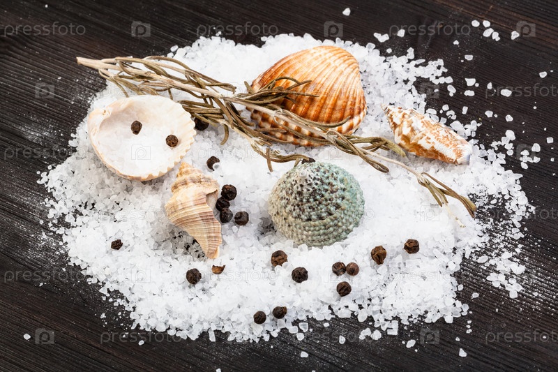 Различные ракушки и крупнозернистая морская соль