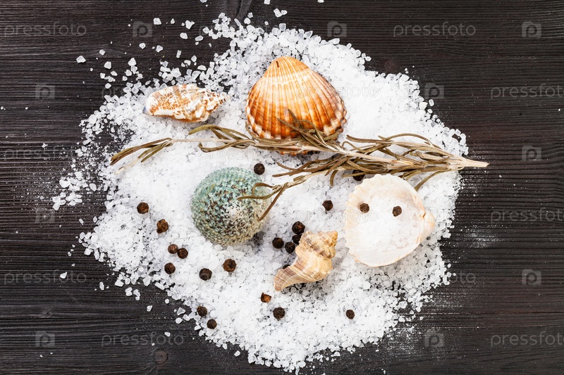 Вид сверху на ракушки, морская соль, перец горошком на столе
