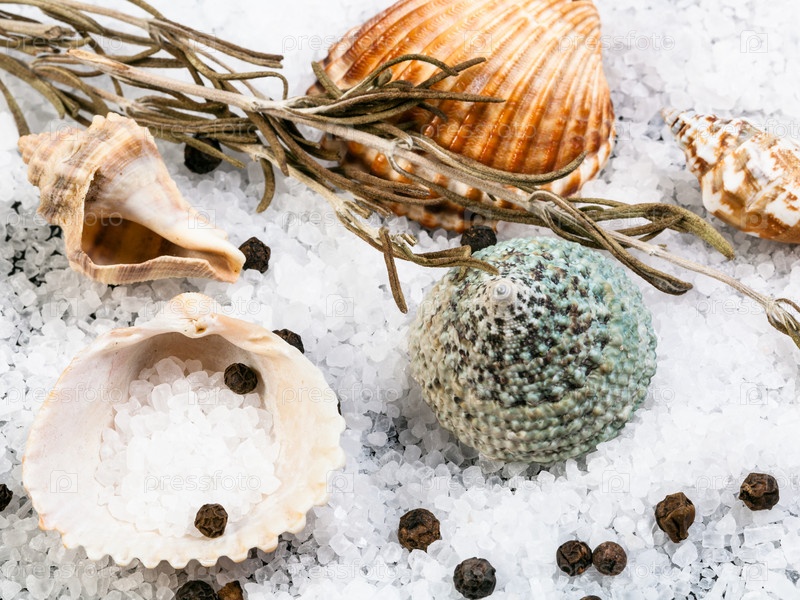 Ракушки, крупнозернистая морская соль и перец горошком