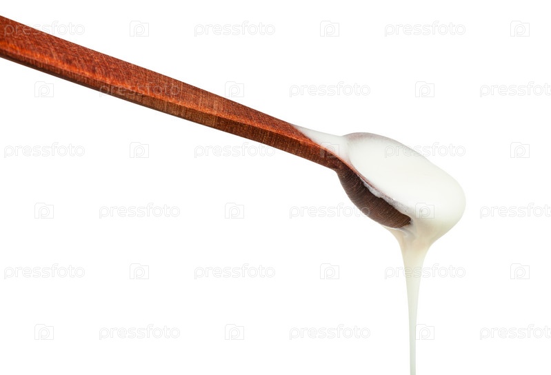 Белый мед течет из деревянной изолированной ложки